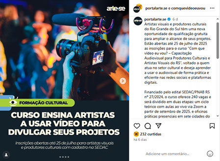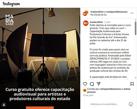 A criadora do curso “Com que vídeo eu vou? – Capacitação Audiovisual para produtores culturais e artistas visuais do Rio Grande do Sul”, explica os detalhes da iniciativa em entrevista transmitida ao vivo no dia 14/07/2025.